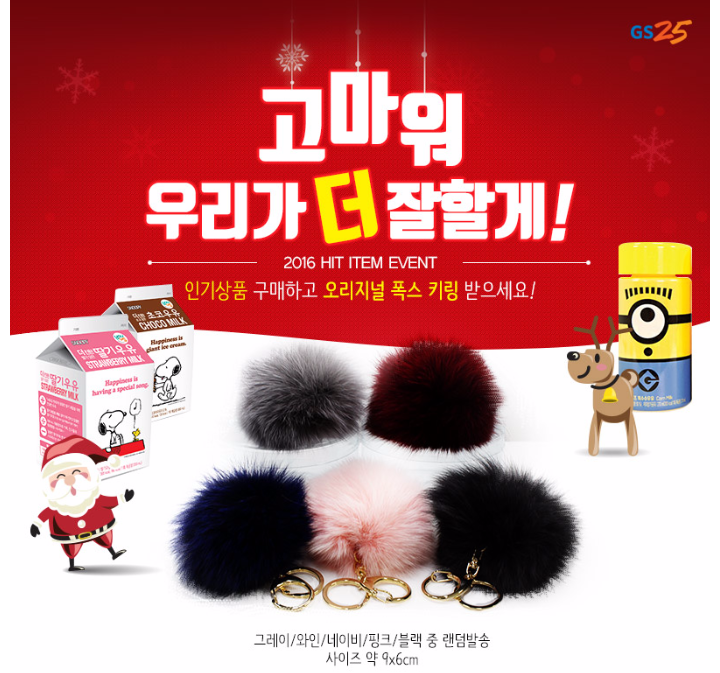 미니언즈 우유와 스누피 우유를 구입하면 응모해서 당첨 100퍼센트인 오히지널 폭스 키링 증정 이벤트가 있어요.