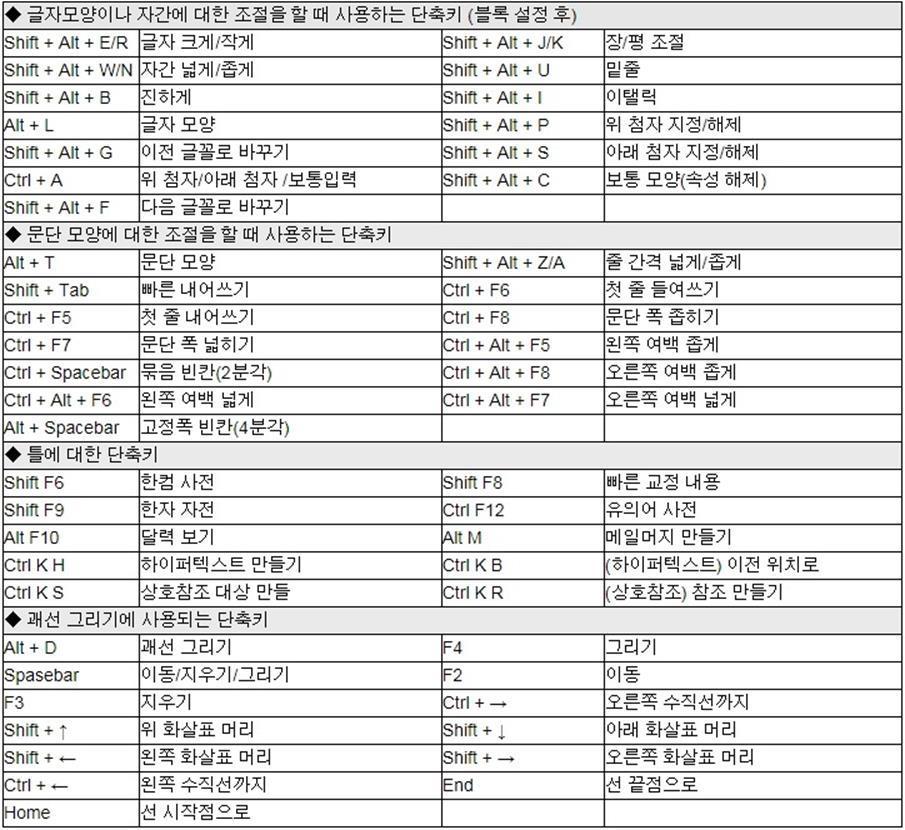 아래 한글 단축키 모음 표 - 한글서식복사, 한글 글자 간격, 줄간격, 장평, 자간단축키, 한글줄맞추기, 특수문자단축키, 한글문자표단축키, 표만들기, 표나누기, 표합치기, 표고정 엑셀 파일