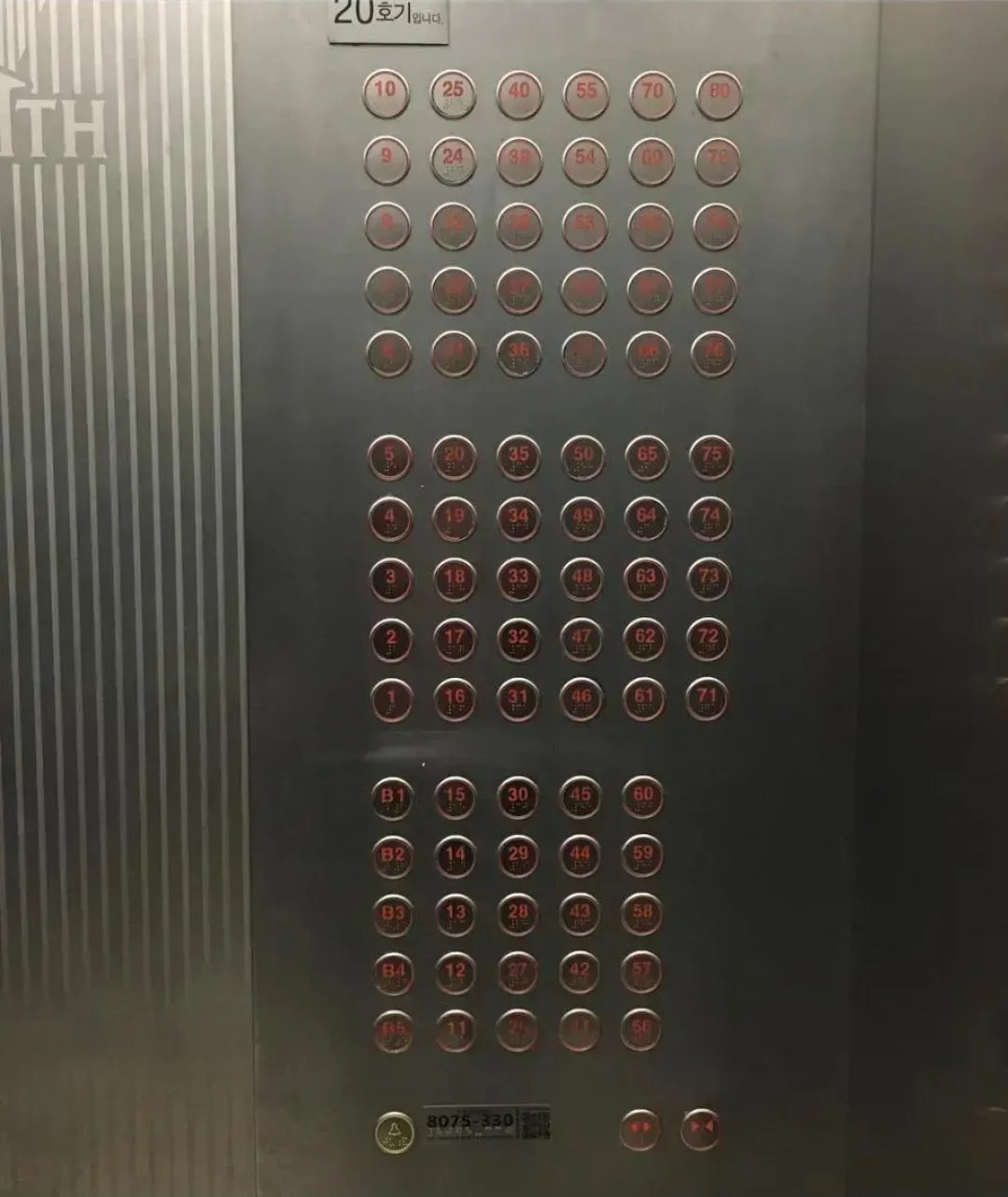 일반적으로 2줄로 되어 있으며, B/0~5(50층대 건물이라)와 0~9까지로 표현되어 있었습니다. 하지만 현대의 50층 이상의 높은 건물들은 디지털 조합 방식의 엘리베이터를 도입하고 있습니다.