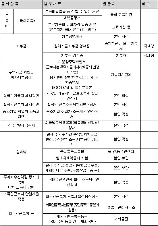 아래의 이미지들은 연말정산에 필요한 서류와 공제항목과 첨부서류 그리고 해당 서류의 발급처를 정리해 둔 표입니다.
