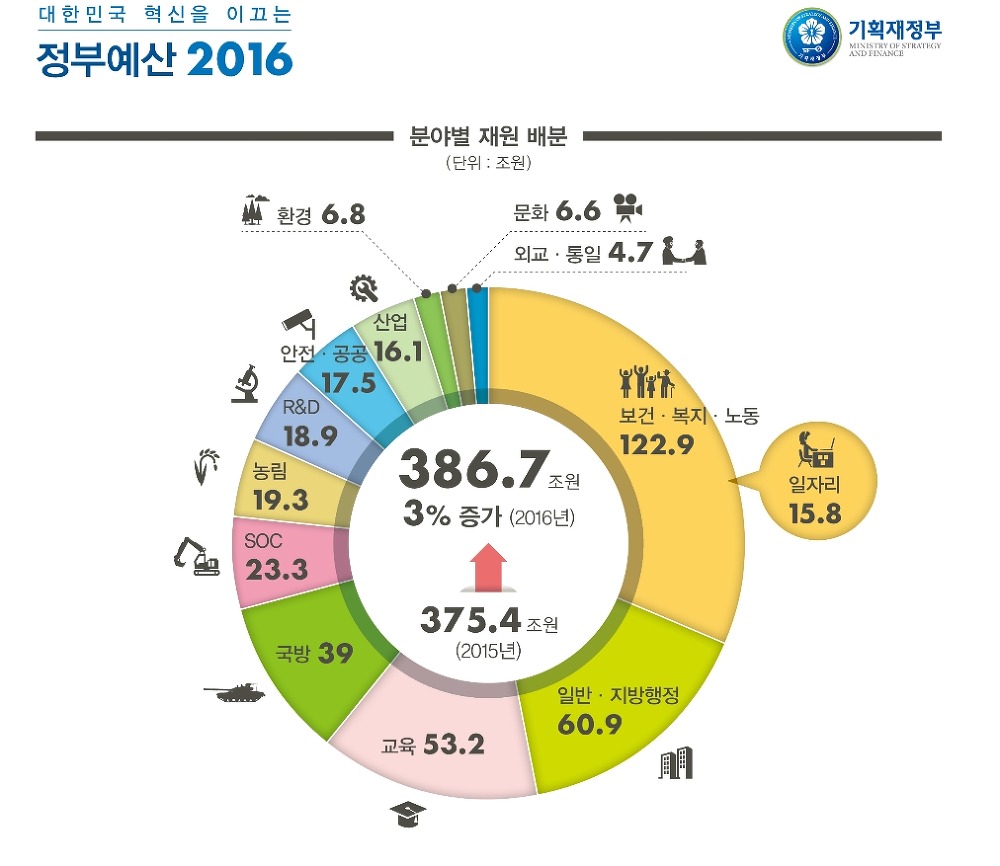 정부의 2016 예산안이 올해보다 3% 증액된 387조원으로 발표되었다.